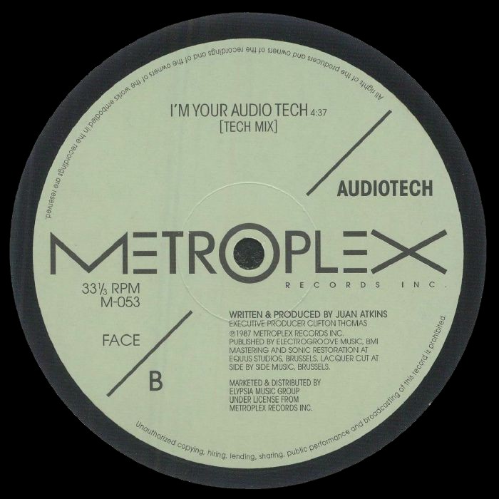 Originally released in 1987 on Express Records, "I'm Your Audio Tech" captures a crucial moment in the evolution of electronic music -- when raw machine funk and futuristic minimalism merged to form the Detroit sound. Now, nearly four decades later, this classic returns newly remastered and presented for the first time on Metroplex, the label founded by Atkins himself. The reissue preserves the deep pulse and metallic warmth of the original, giving new clarity to its hypnotic basslines and mechanized rhythm patterns that defined an era of innovation. A timeless piece of Detroit's musical DNA -- meticulously restored for a new generation of listeners and collectors.