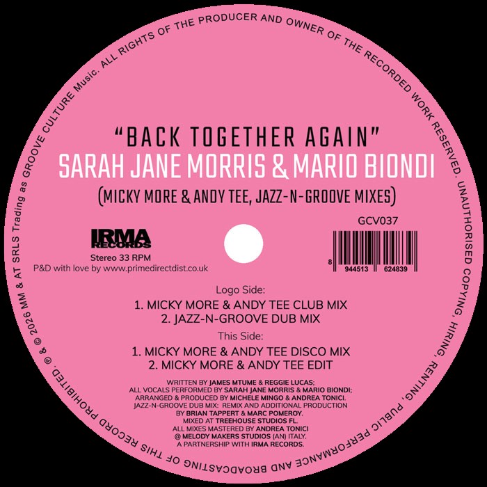 On this attractive 12", Italy's Groove Culture crew - and invited guests - give their takes on 'Back Together Again', a surprise collaboration between long-serving British singer Sarah Jane Morris and Italian dance music mainstay Marco Biondi. The majority of the mixes come from label chiefs Micky More and Andy Tee. They first deliver a piano-rich, lightly disco-tinged soulful house 'Club Mix' that showcases both Morris and Biondi's vocals, before re-building the track as a horn-sporting, mid-tempo disco-boogie gem of the sort made famous by Teena Marie in the 1980s (the 'Disco Mix'). They've also delivered an 'Edit' that neatly showcases the jazz-funk-goes-soul flavour of the (not included) original mix. The other mix comes from veterans Jazz-N-Groove, who successfully swim in classic US garage waters.